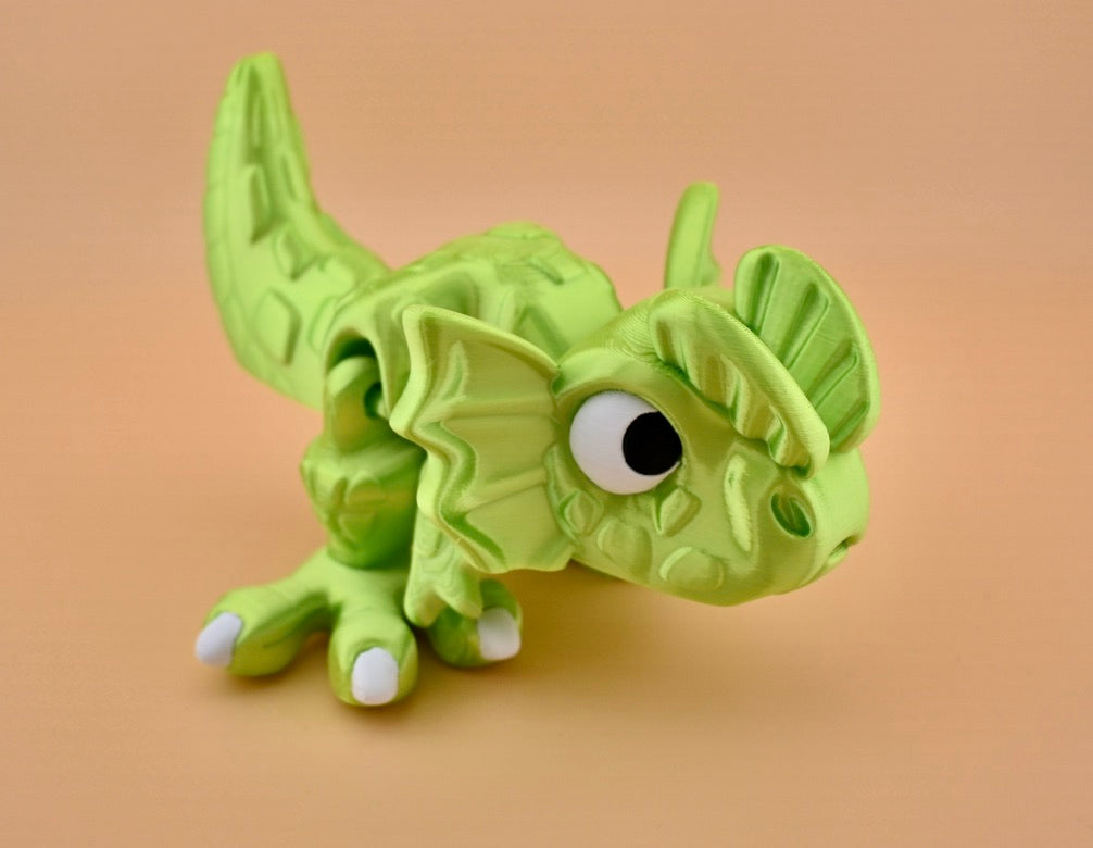 The silk lime green Dilophosaurus from the Chomper Collection features articulated legs, enhancing its educational and interactive value. This detailed 3D toy supports learning through play and offers a tactile experience ideal for fidgeting, making it a versatile addition to any collection.